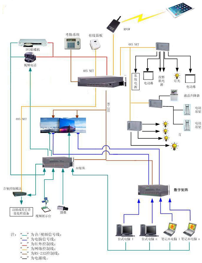 A/V系統(tǒng)由4臺(tái)計(jì)算機(jī)、攝像機(jī)、DVD、實(shí)物展臺(tái)、調(diào)音臺(tái)、話筒、功放、音箱、數(shù)字硬盤錄像機(jī)等A/V設(shè)備構(gòu)成。完成對(duì)各種圖文信息(包括各種軟體的使用、DVD/CD碟片、各種實(shí)物、聲音)的播放功能;實(shí)現(xiàn)多功能廳的現(xiàn)場(chǎng)擴(kuò)音、播音,配合大屏幕投影系統(tǒng),提供優(yōu)良的視聽效果。并且通過(guò)數(shù)字硬盤錄像機(jī),能夠?qū)⒄麄€(gè)過(guò)程記錄在硬盤錄像機(jī)中。