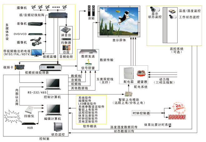 體育場(chǎng)館的專業(yè)性及其使用環(huán)境決定了LED顯示屏的框架結(jié)構(gòu)設(shè)計(jì)和電路結(jié)構(gòu)設(shè)計(jì)與其他顯示屏不同,同時(shí),由于體育場(chǎng)館LED顯示屏的使用頻率相對(duì)不高,一旦使用,必定是觀眾聚集,出現(xiàn)任何故障都會(huì)帶來(lái)負(fù)面影響,因此其質(zhì)量要求更高,使用和維護(hù)必須簡(jiǎn)便,電路結(jié)構(gòu)設(shè)計(jì)應(yīng)當(dāng)能夠讓用戶在現(xiàn)場(chǎng)及時(shí)排除臨時(shí)的故障。因此,學(xué)校體育場(chǎng)館顯示屏的功能比其他場(chǎng)所的顯示屏要求更高,文字、動(dòng)畫、視頻圖像僅僅是基本功能,系統(tǒng)功能軟件應(yīng)涵蓋能夠舉辦的所有體育比賽項(xiàng)目的計(jì)時(shí)、記分等比賽信息的發(fā)布,以及集會(huì)中的文字、圖像顯示功能。