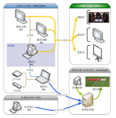體育館兩邊安裝兩塊LED顯示屏,兩塊屏后的控制室內(nèi)分別設(shè)立控制電腦,負(fù)責(zé)大屏的控制和顯示,大屏通過(guò)LED數(shù)據(jù)和控制電腦相連。場(chǎng)館內(nèi)設(shè)立局域網(wǎng),兩臺(tái)LED顯示屏控制電腦都連入網(wǎng)絡(luò),同時(shí)比賽期間放于場(chǎng)邊的裁判操作電腦連入局域網(wǎng),該電腦與籃球打分控制器相連接,比賽時(shí)裁判只需要在場(chǎng)邊進(jìn)行打分。兩塊大屏可同時(shí)顯示相同信息,也可以各自分別顯示不同的內(nèi)容。兩邊的籃球架上都安裝籃球24秒專用顯示屏,并用數(shù)據(jù)線連接到場(chǎng)邊的24秒控制臺(tái)上,比賽中可由專人負(fù)責(zé)進(jìn)行比賽和24秒計(jì)時(shí)操作。24秒控制臺(tái)與場(chǎng)邊的裁判控制電腦可以使用數(shù)據(jù)線連接,則也可以使用軟件來(lái)控制24秒計(jì)時(shí)的顯示同時(shí)在場(chǎng)邊配置了一套籃球?qū)S玫姆敢?guī)顯示器(單面顯示),用于顯示賽隊(duì)犯規(guī)次數(shù)。 一套籃球?qū)S们驒?quán)控制器(單面顯示),指示當(dāng)前控球權(quán)的一方。在單獨(dú)的一臺(tái)電腦上安裝籃球比賽用軟件,用于統(tǒng)計(jì)賽程中球員的賽場(chǎng)表現(xiàn)情況。比分直播系統(tǒng)通過(guò)與體育場(chǎng)館比賽計(jì)分系統(tǒng)、籃球技術(shù)統(tǒng)計(jì)軟件進(jìn)行通訊,在采集多路現(xiàn)場(chǎng)視頻信號(hào)的同時(shí),對(duì)信號(hào)進(jìn)行本地化的快速編輯處理,實(shí)現(xiàn)現(xiàn)場(chǎng)實(shí)時(shí)比分疊加、球員信息顯等視頻播放要求。賽場(chǎng)的多媒體綜合信息發(fā)布系統(tǒng),與賽場(chǎng)計(jì)時(shí)記分系統(tǒng)聯(lián)動(dòng),用于在賽場(chǎng)周邊的屏幕上統(tǒng)一管理和發(fā)布球場(chǎng)相關(guān)的球賽得分信息、球員及裁判信息、廣告以及相關(guān)資訊、指引等。